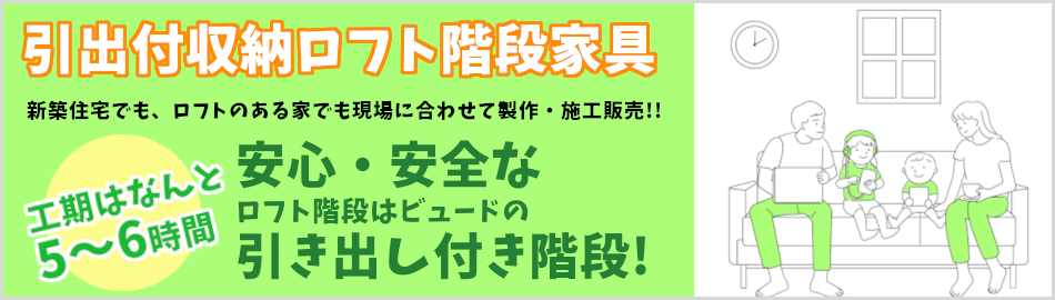 引出付ロフト収納階段のことなら「有限会社ビュード」にお任せ下さい。 是非お問い合わせをお待ちしております。 TEL:048-526-8012 |