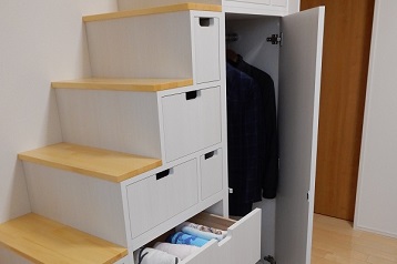 【階段収納の強度や昇降のしやすさは?】 ①神奈川県鎌倉市 M・Tさん 高さがある割に階段としてのスペースが少ないのですが階段の昇降もしやすいです。 なにより頑丈!階段の利用時に全く不安がありません。 ②神奈川県座間市 Tさん 高い所が少し怖いというと、手すりをガッチリとした取付にしてくださったり、 私の足のサイズが大きいと言うと踏板を少し大きめに作って下さったり、ユーザーの使い勝手や、安心感に、 こだわったモノづくりをされていると感じました。大満足の仕上がりです! ③埼玉県熊谷市 Oさん パソコンやプリンターなど収納したい物に合わせた設計、階段を安全に昇り降りできるしっかりとした手すり、 設置後の生活導線も考えてくださるなど、細かい部分にたくさんの配慮があり、安心して作製をお任せすることができました。 階段下の空間を有効な収納スペースにした階段です。工期も早く5~6時間で完成!!! 後付け工事ができますので、まずは一度ご相談ください。 何かご不明点等についてもご連絡お待ちしております。 |
