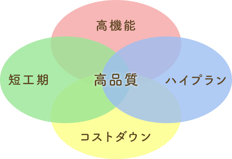 しかし現実的に、そのソフトも確かなハードで支えられていなければ何もなりません。私たちは、工場での生産から、独自技術によるスピード施工まで一貫した住まいづくりを通して、高い耐震強度、安定した高品質と効率化を追及しコストパフォーマンスの実現化を狙っています。それがご家族の夢の結晶を幸福な時間で彩ることができると考えています。ご家族の夢の結晶、『わたしの自慢の家』をテーマに展開を続けています。