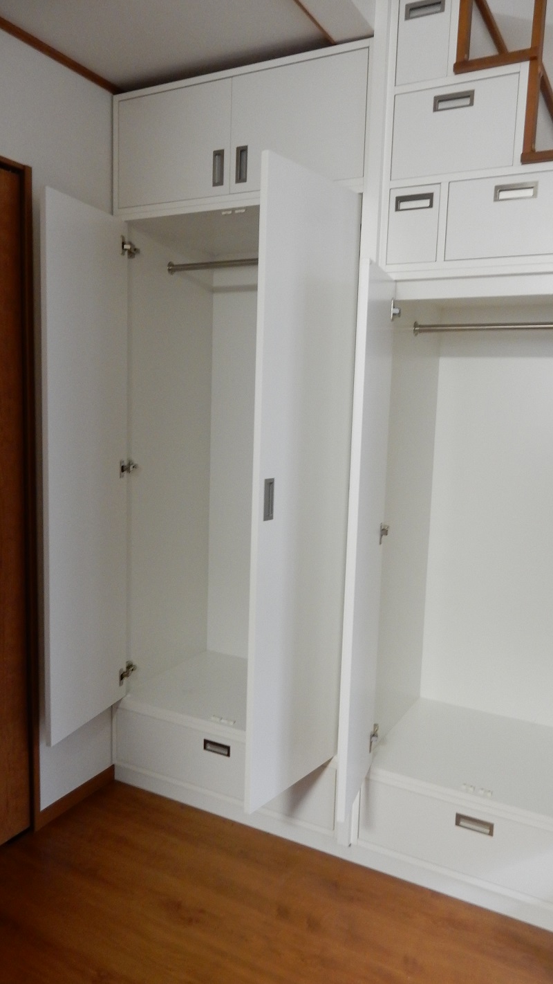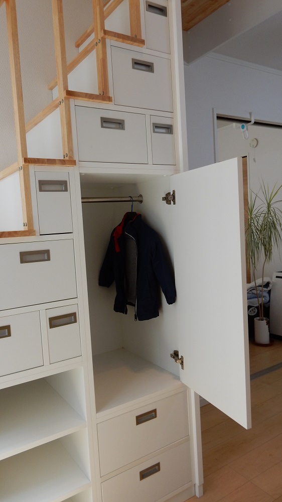 収納部分の洋服タンスは可動棚になっており経過の変化でコートを掛けたり、洋服、諸棚の役にも変化します。