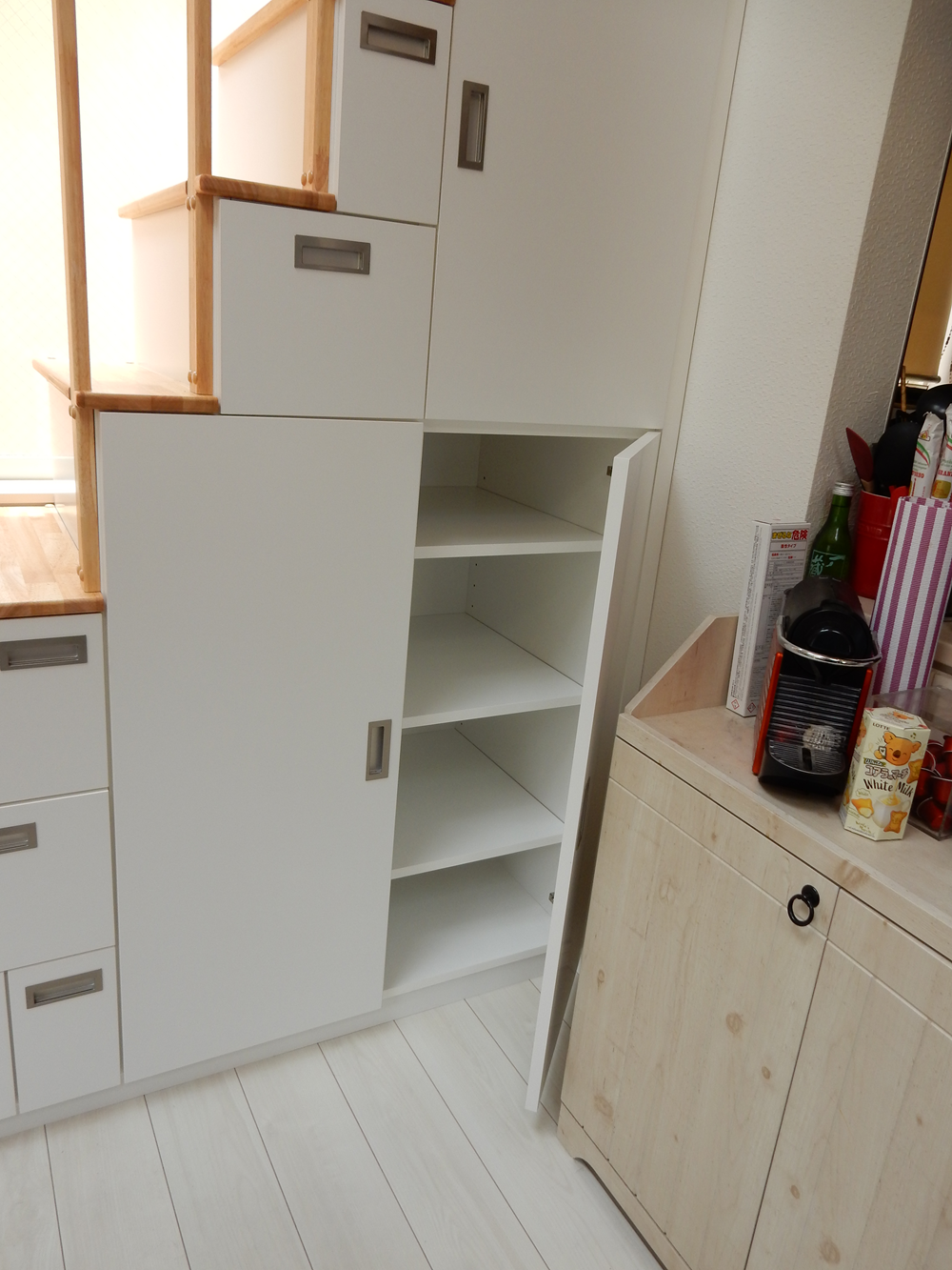 ※引き出し付き階段下の収納ボックスには前扉がセットされています。