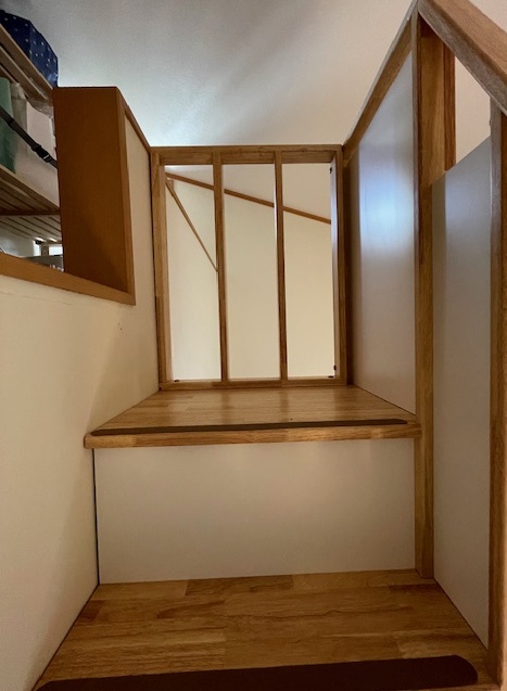 その他にも、高い所が少し怖いというと、手すりをガッチリとした取付にしてくださったり、私の足のサイズが大きいと言うと踏板を少し大きめに作って下さったり、ユーザーの使い勝手や、安心感に、こだわったモノづくりをされていると感じました。大満足の仕上がりです!