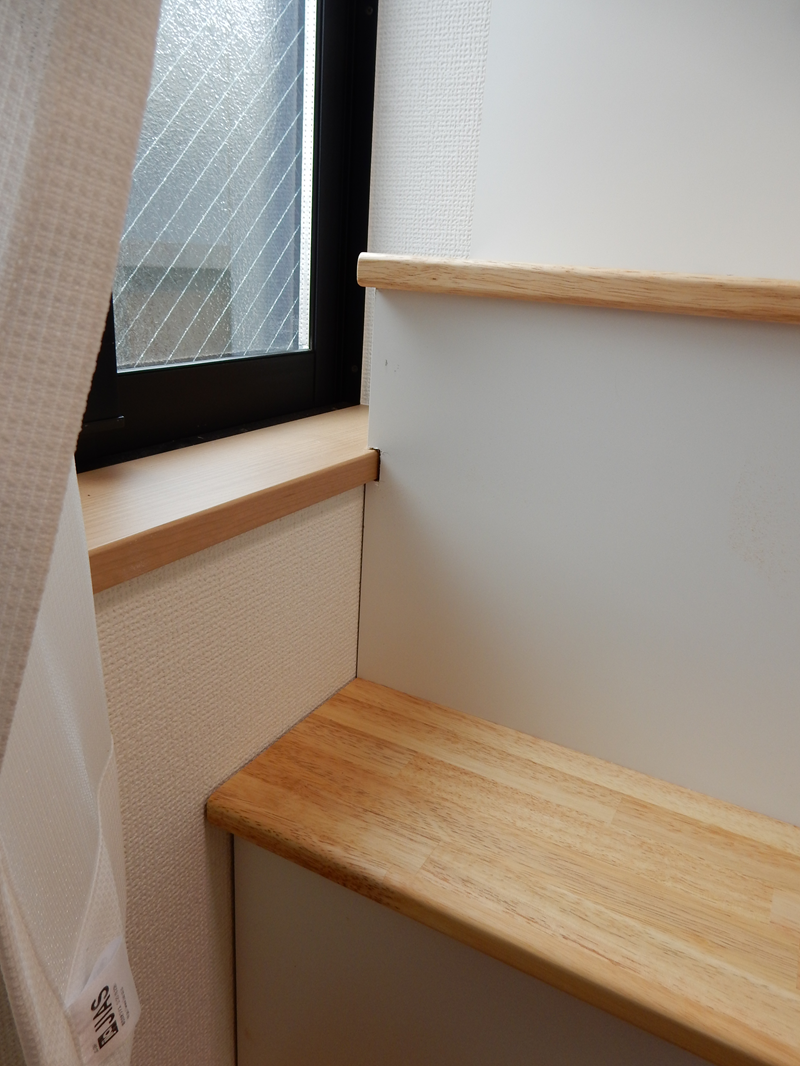 階段が採光窓の一部を塞ぐ形になりましたが、許容範囲内とご判断いただきました。また、「窓枠の出」が大きかったため、壁側と階段の隙間を塞ぐ作業に多少の工夫が必要となりました。